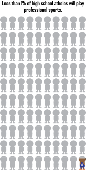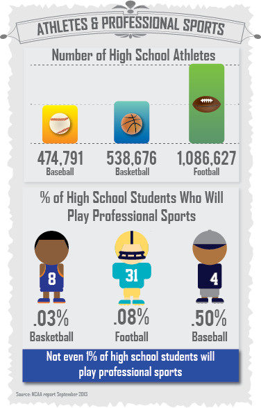 According to a 2013 study by the National Collegiate Athletic Association (NCAA) there were more than eight million high school athletes that played men’s/women’s basketball, football, baseball, men’s ice hockey, and men’s soccer. Out of those athletes 460,000 went on to play at a NCAA school. Those that went on to play at the professional level varied from .9% to 8.6%. Below are the statistics (by sport) for draft-eligible college athletes who were drafted to play a professional sport: