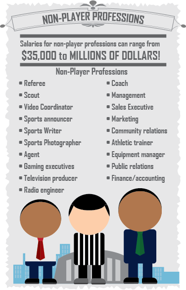 Furthermore, there are a number of other sports related jobs outside of a traditional sports team. These careers include an agent (lawyer), working for an agency in marketing, and player relations or in sports marketing for apparel makers like Nike, Adidas, Under Armour, etc.
