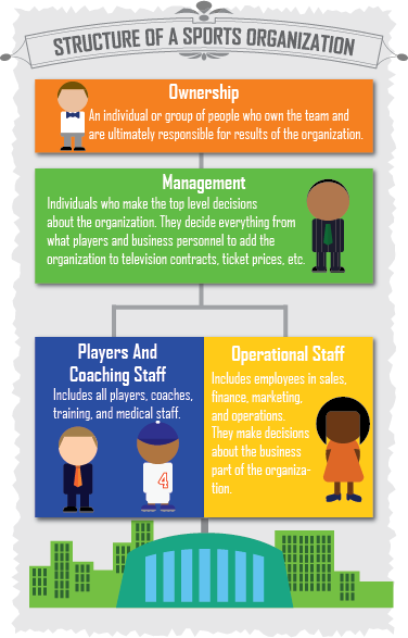 A sports organization at all levels is just like any other business. They require the services of many individuals to conduct its business operations. This includes individuals who work in sales, marketing, finance, and accounting. For example, professional as well as college football teams need individuals to sell tickets (sales), announce the game (announcers), market the team (marketing), communicate with the media (public relations), and people to track revenue and payroll (finance). This combined effort makes up a sports organization.