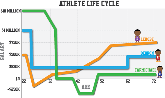 The graph below provides a snapshot of each athlete’s life cycle. It demonstrates how Carmichael will make less money than Debron and LeKobe later in life. Now you may be thinking, “How could this be? Carmichael signed a Retirement Contract while Debron and LeKobe each have Head Start and Comfortable contracts.” Well, let’s see how this can happen!